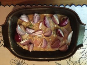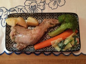 Mivel nem ismertem fel a porcikákat, kivettem a jégtérből három zacskót, amiben – gondolom – a nyúl darabkái voltak. Így lett egy gerinc, két láb és mell (így leírva kissé hidegszívűen hangzik, de csak így lehet, ha az ember lánya egy kedves mesefigura földi maradványait készül szervírozni). Megsóztam, borsoztam, kentem rá két nagy evőkanál mustárt, négy gerezd apróra vágott fokhagymát, két rozmaring ágról minden letépkedett levelet, öntöttem rá 2-3 dl száraz rozét, egy kis olajat – mindezt jól megforgattam, s betetettem a hűtőbe egy éjszakára. Néha megrázogattam, amíg ébren voltam.