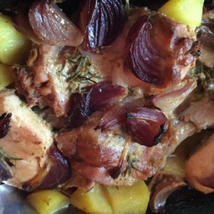 Másnap egy agyagtálba tettem a darabokat, ráöntöttem a páclevet, dobáltam bele negyedelt lilahagymát, fokhagymagerezdeket, rátettem a tetejét, és uccu a sütőbe. Mikor már kb. egy-másfél órája sült, levettem a tál tetejét, hogy párologjon egy kicsit a leve, és piruljon is. Rózsaszín-barna színű volt, mikor lezártam alatta a gázt. Sós, ételízesítős vízben főtt brokkolit (nem kell agyonfőzni, négy-öt perc alatt puha annyira, hogy senki nem töri bele a fogát) és szép nagy répákat adtam mellé (ha már nyúl :)). Volt még persze krumpli is, sós vízben főzve, s utána fokhagymás olajon megfuttatva (itt dobáltam a nyúl mellé is).