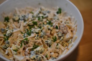 Végy egy kövér zellergumót és három savanykás almát. Kérjed meg az egyik segítségedet, hogy pucolja meg őket, az almák magházát likvidálja. A zellert vágja kövér gyufaszál méretűre (elegánsabbak zsülienként definiálnák), az almát vékonyka kockákra vagy minek nevezzem azt a formát, ami laposkás téglatest. Rakd egy tálba, és öntsd nyakon egy fél citrom levével. Három marék diót apróra vágva és néhány dióbelet egészben hagyva szárazon pirítsd meg egy serpenyőben. Határozottan jót tesz neki, ha a másik segéded egy óvatlan pillanatban megszórja kristálycukorral, ami a sütögetés hatására vékony karamellréteggel vonja be a diókat. Itt némi pihenés következik, amíg a karamelles diók egy részét elfalatozgatjátok, hajdanvolt grillázs menyasszonyi tortákon merengve. A dió maradékát hozzákevered az alma-zeller kombóhoz, kis darab márványsajtot morzsolsz rá, és nyakonöntöd egy kis pohár joghurt, kis pohár tejföl és némi majonézből készült öntettel. Só, bors, a tetejére apróra vágott petrezselyem.