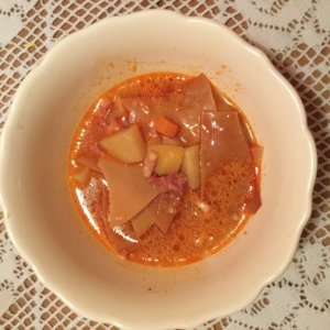 Keves zsiradékon megfuttatok némi felkockázott szalonnát, egy hagymát megdinsztelek rajta. Dobálok rá apró kockára vágott sárgarépát, fehérrépát, zellert, krumplit. Kavarintok rajta egyet, rászórok egy kis őrölt pirospaprikát, majd felöntöm vízzel. Mivel leves, és jön még bele tészta, kicsit legyen több víz, mint ami ellepi a zöldségeket. Egy csokor petrezselymet dobok bele, sózom, borsozom, két apróra vágott fokhagymagerezdet is beleszórok – magára hagyom, hadd főjön.